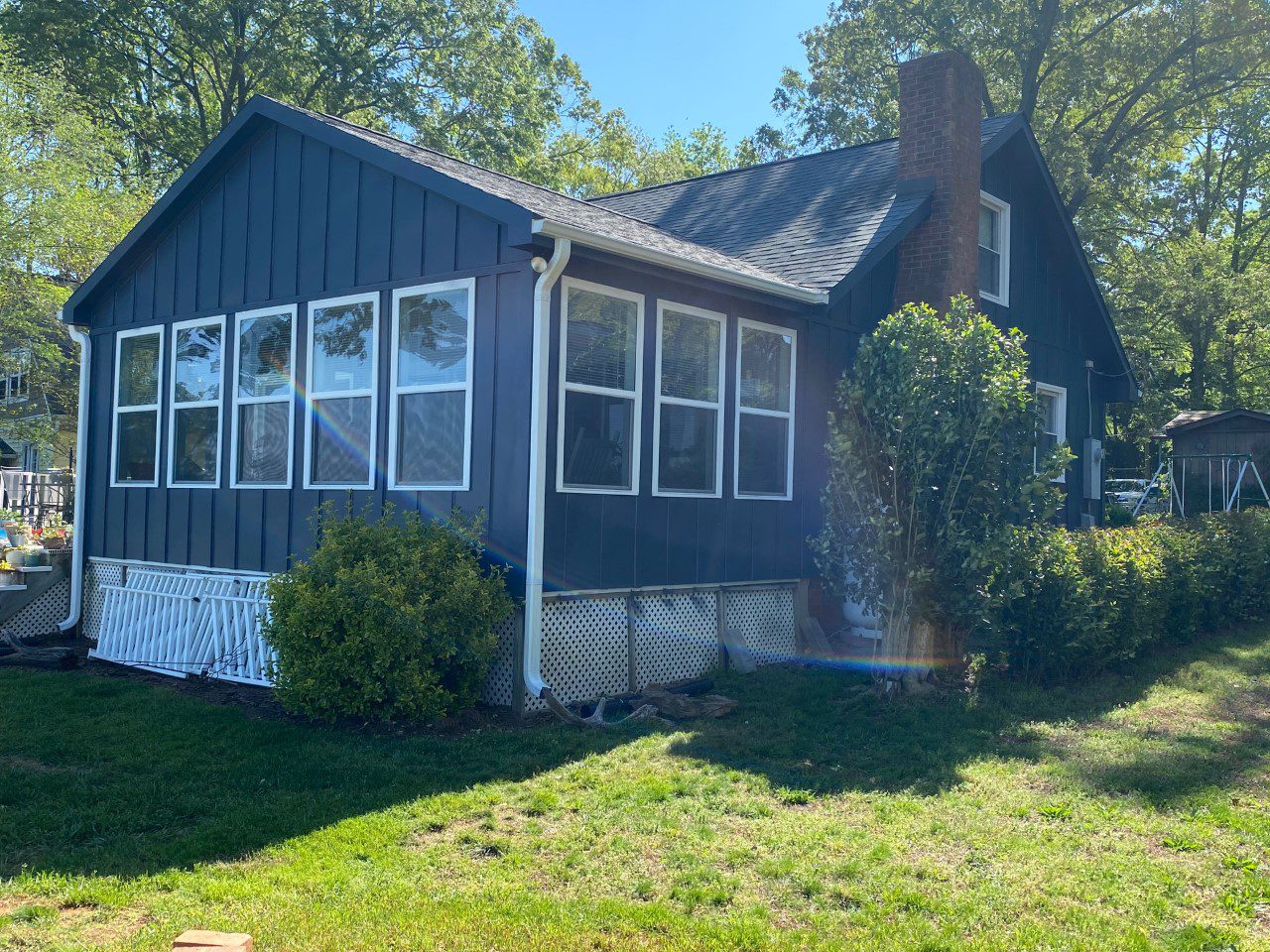 We used the board and batten approach with vertical boards accented by strips that are raised. This style of exterior dates back to the early years of farmhouses and offers a unique and whimsical touch to this cute bungalow. Using a dark blue, Deep Ocean, gives the house a rich and sophisticated look as the white accents pop against it. It was a smart choice for the property owners, as it looks stunning online.