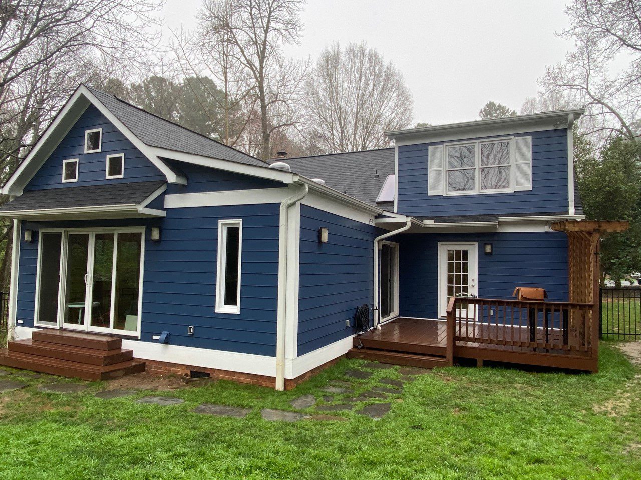 The second part of this exterior renovation included a roof replacement. We removed the old roof, made any necessary repairs, and then installed the new shingles. The dark gray of the shingles complements the blue and white perfectly.
