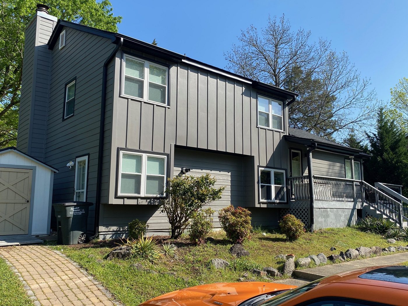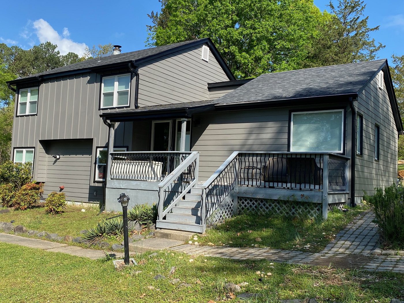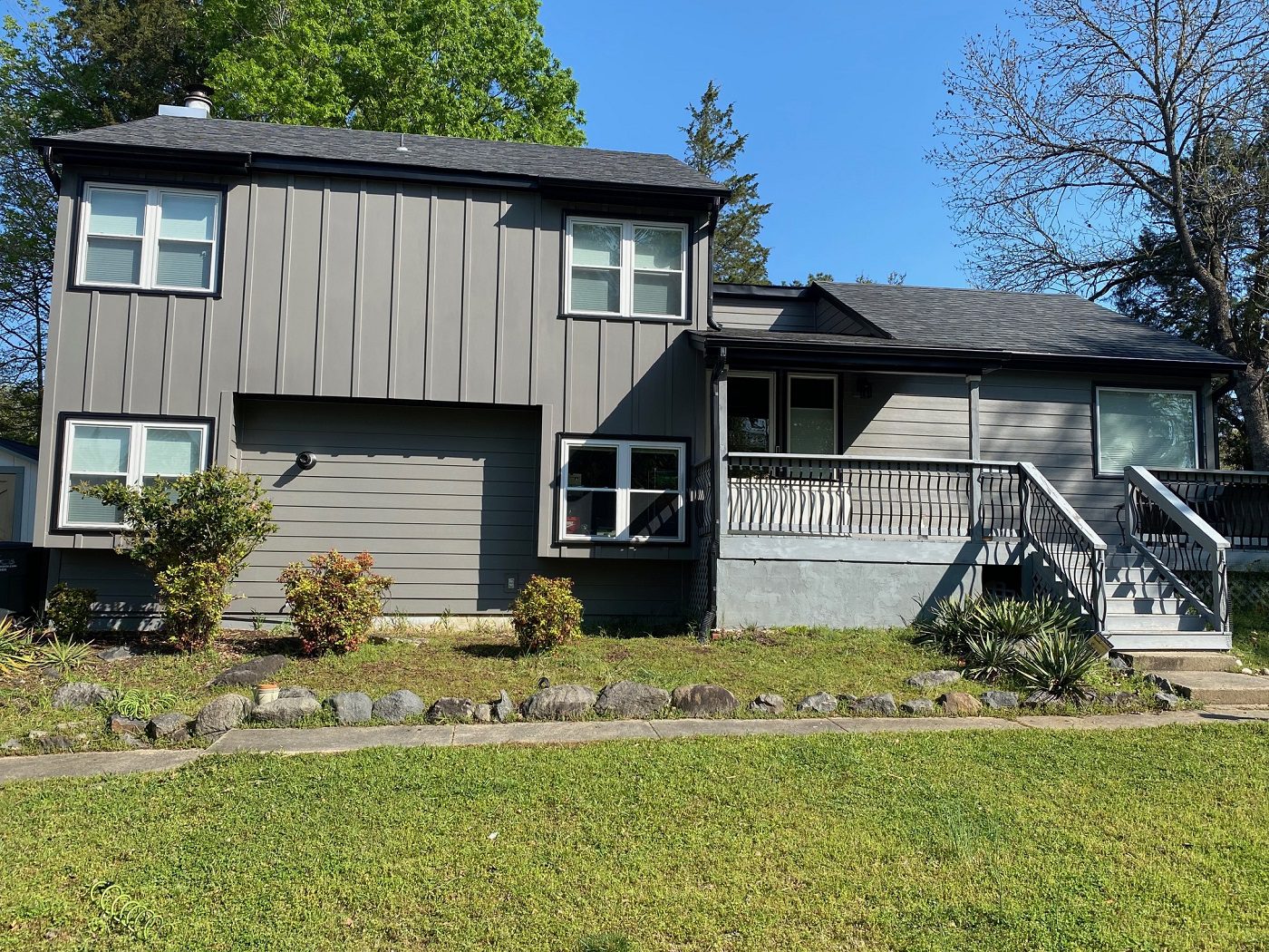 For this particular project, we updated this home’s exterior with new HardiePlank siding in a warm gray tone. We also added new gutters in black to compliment the colors they chose for the new siding along with a new vinyl soffit.